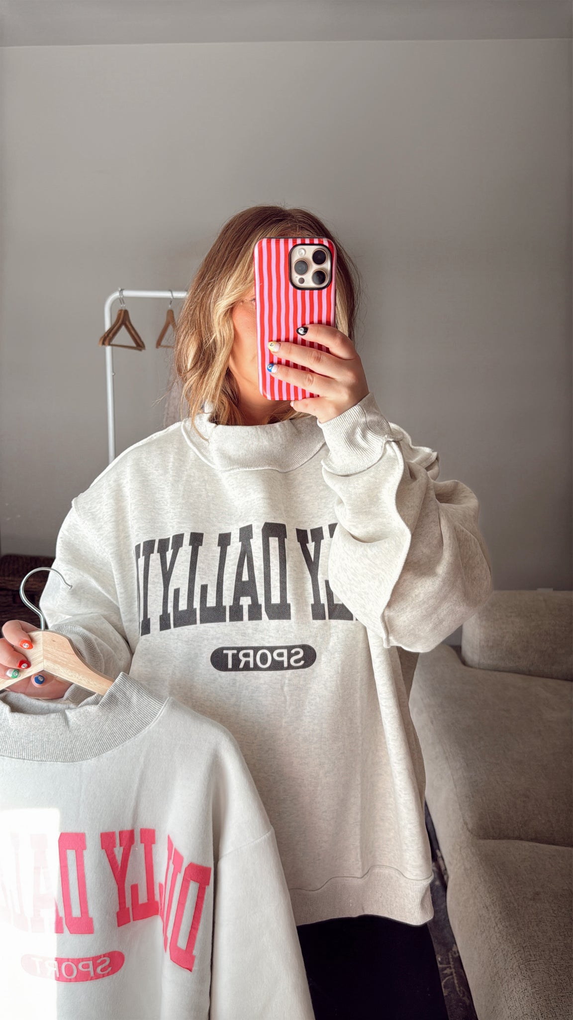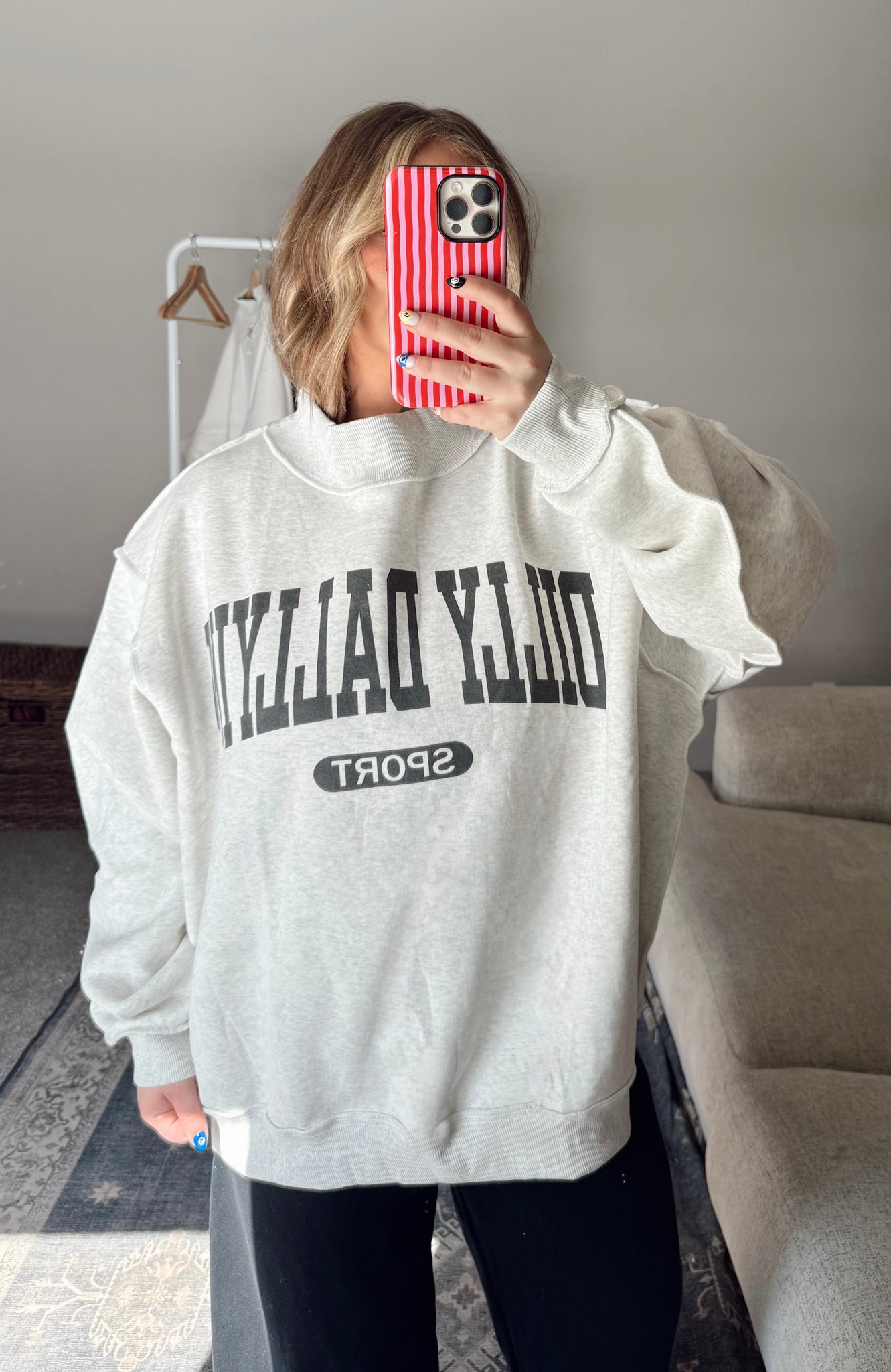 oversized, exposed seams ash grey mock neck with BLACK DILLY DALLYIN SPORT logo on outside & HOT PINK DILLY DALLYIN SPORT logo on reverse side. Cozy fleece to keep you warm. Ribbed cuffs & hemline.