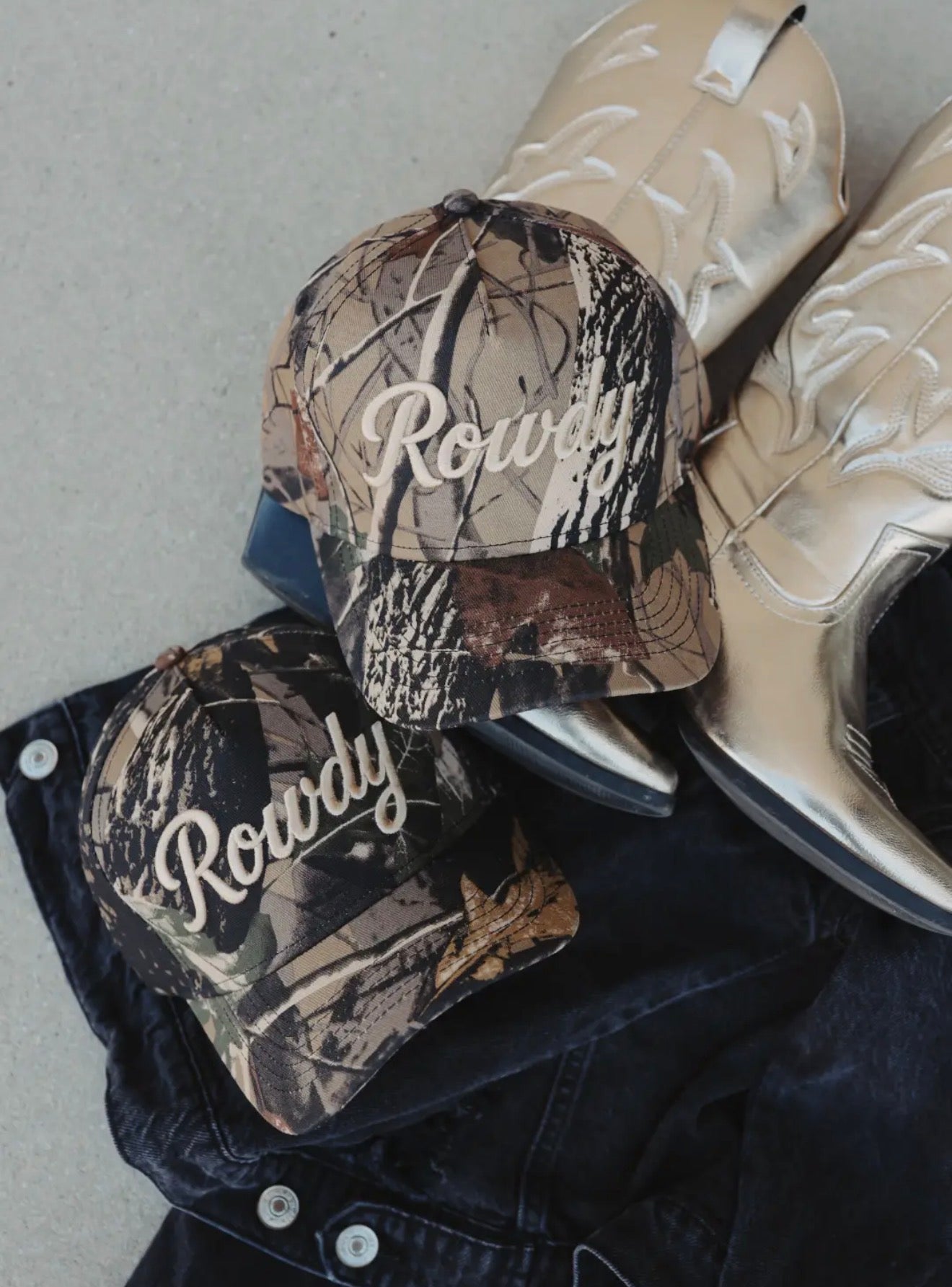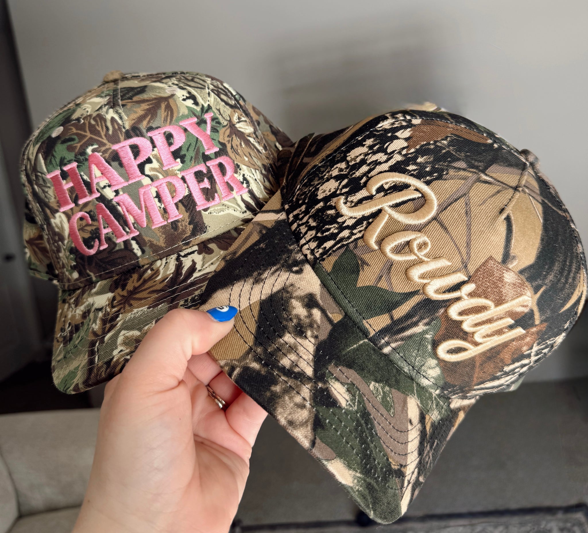 beige embroidered design on a camo trucker