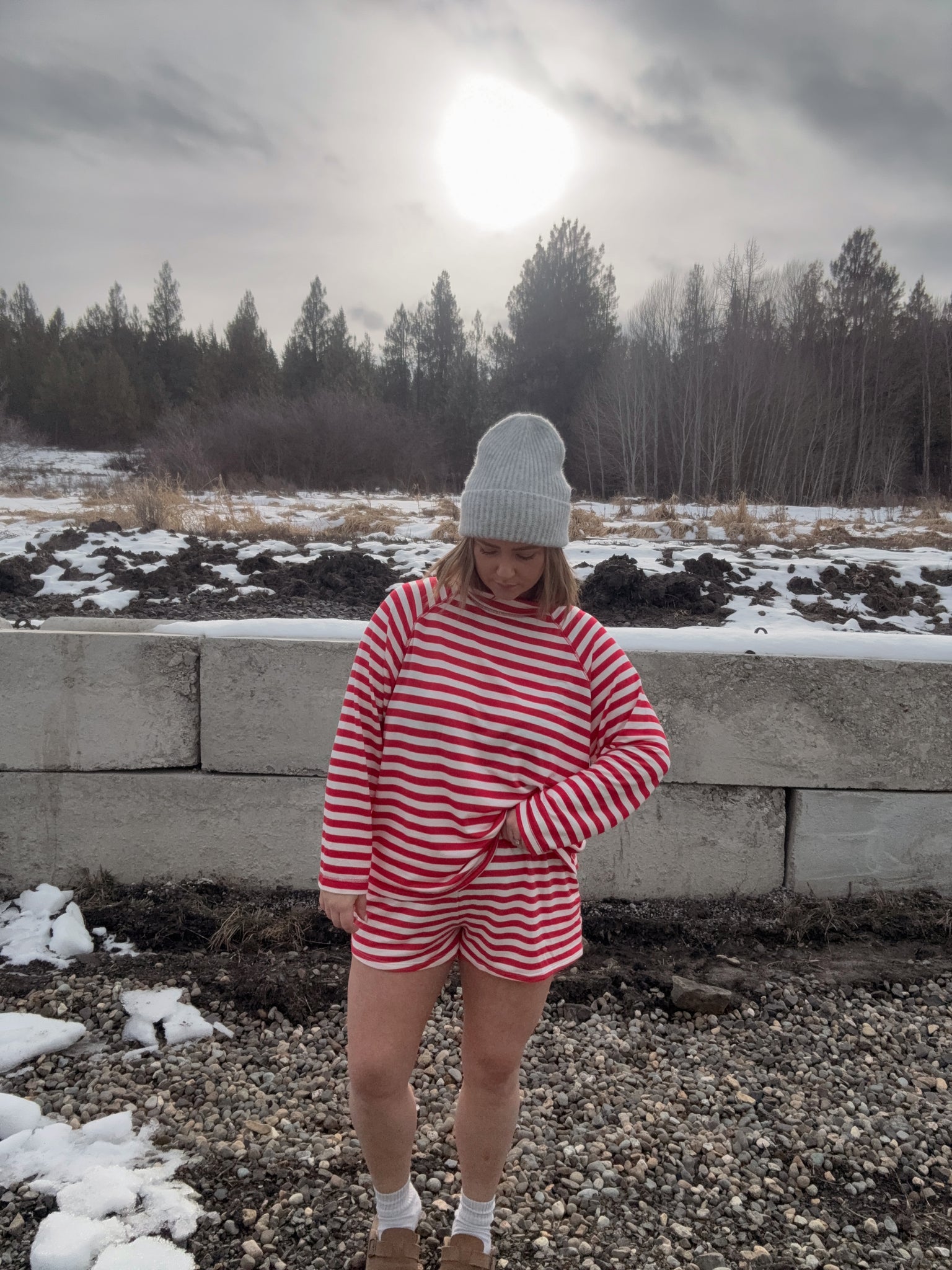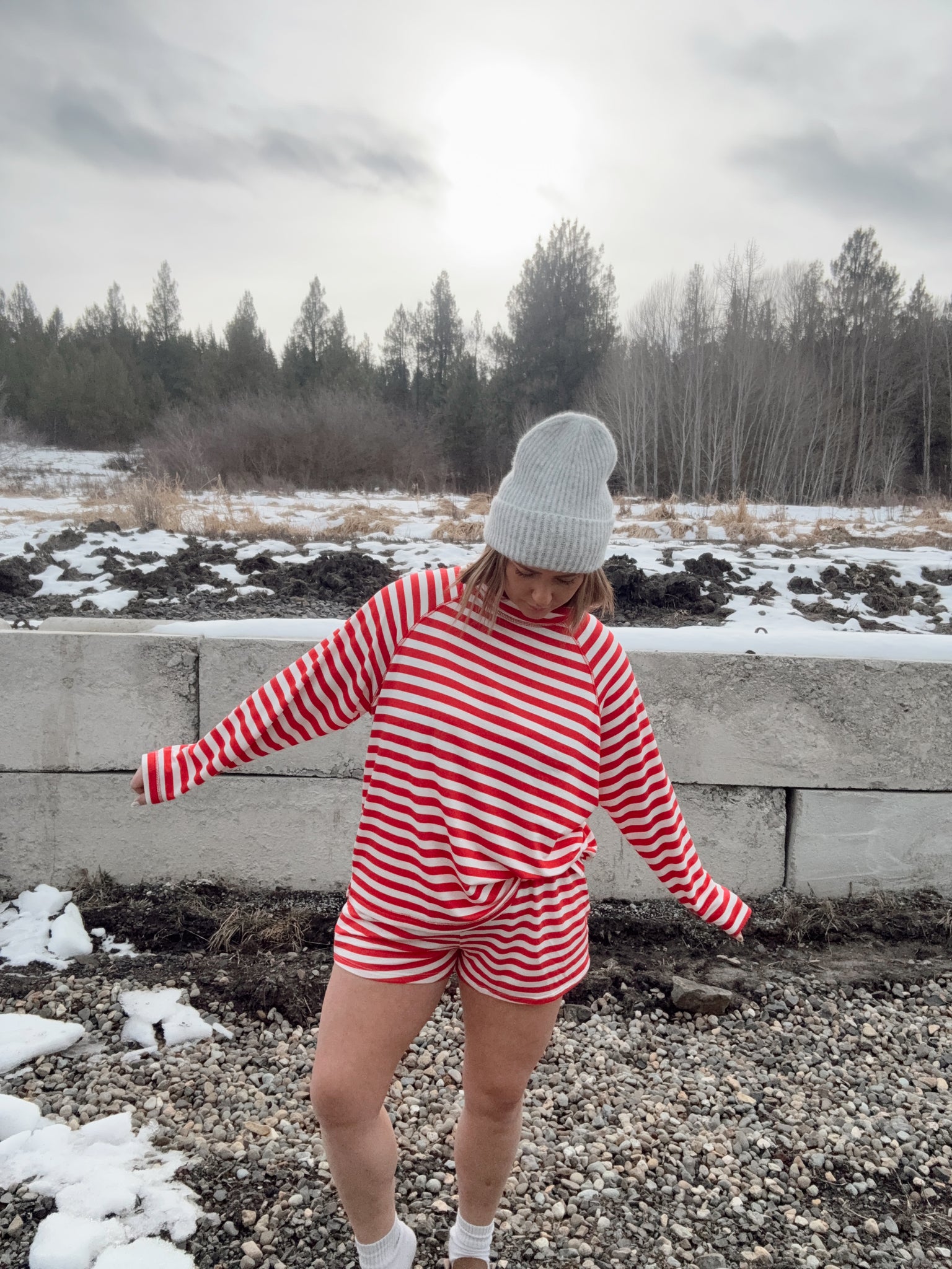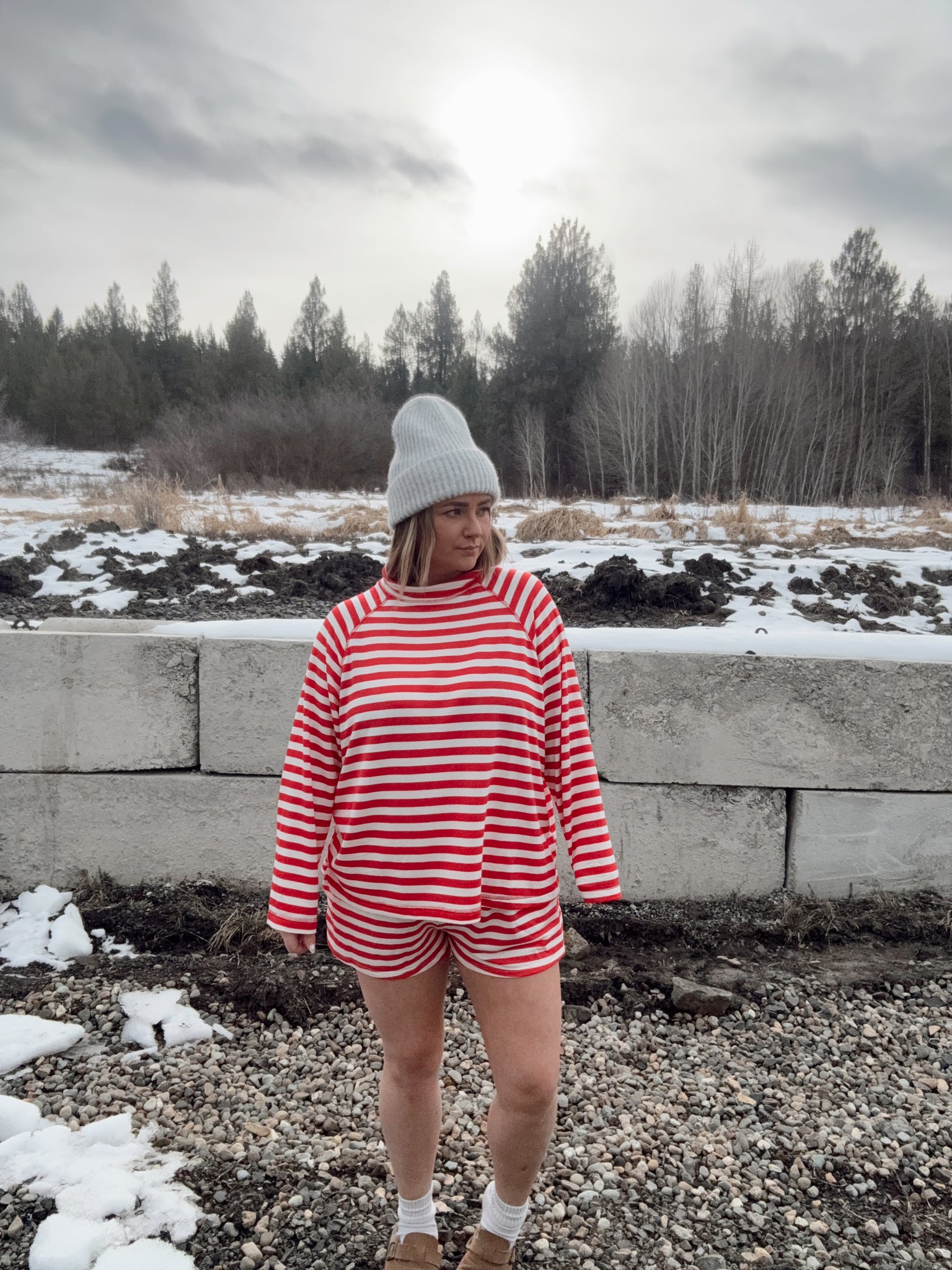 red & white stripe short set with long sleeve top! Oversized top with true to size shorts! Shorts have an elastic waistband and side pockets. Top has a relaxed fit & mockneck! Wear to lounge around the house in or out & about once it warms up!