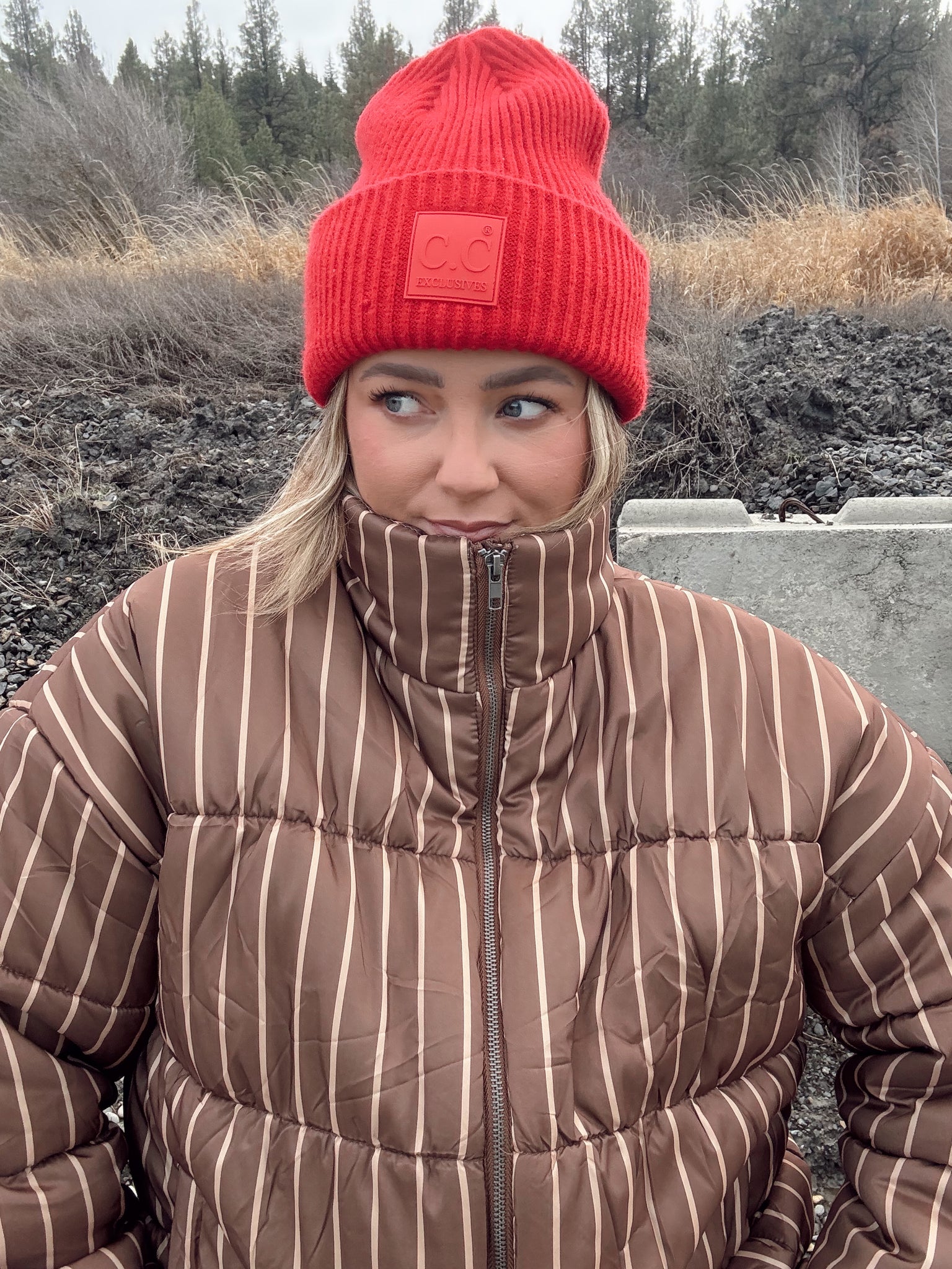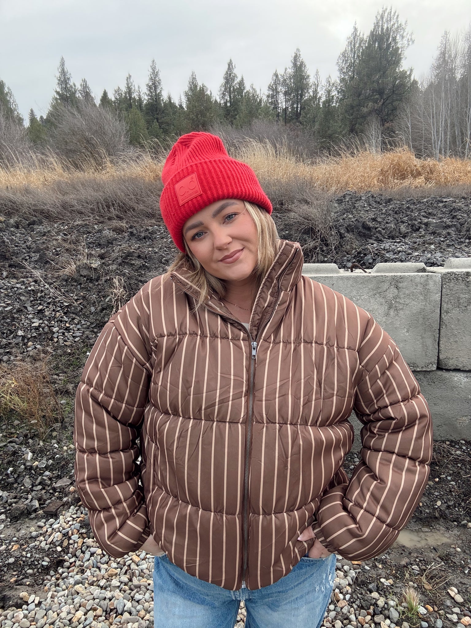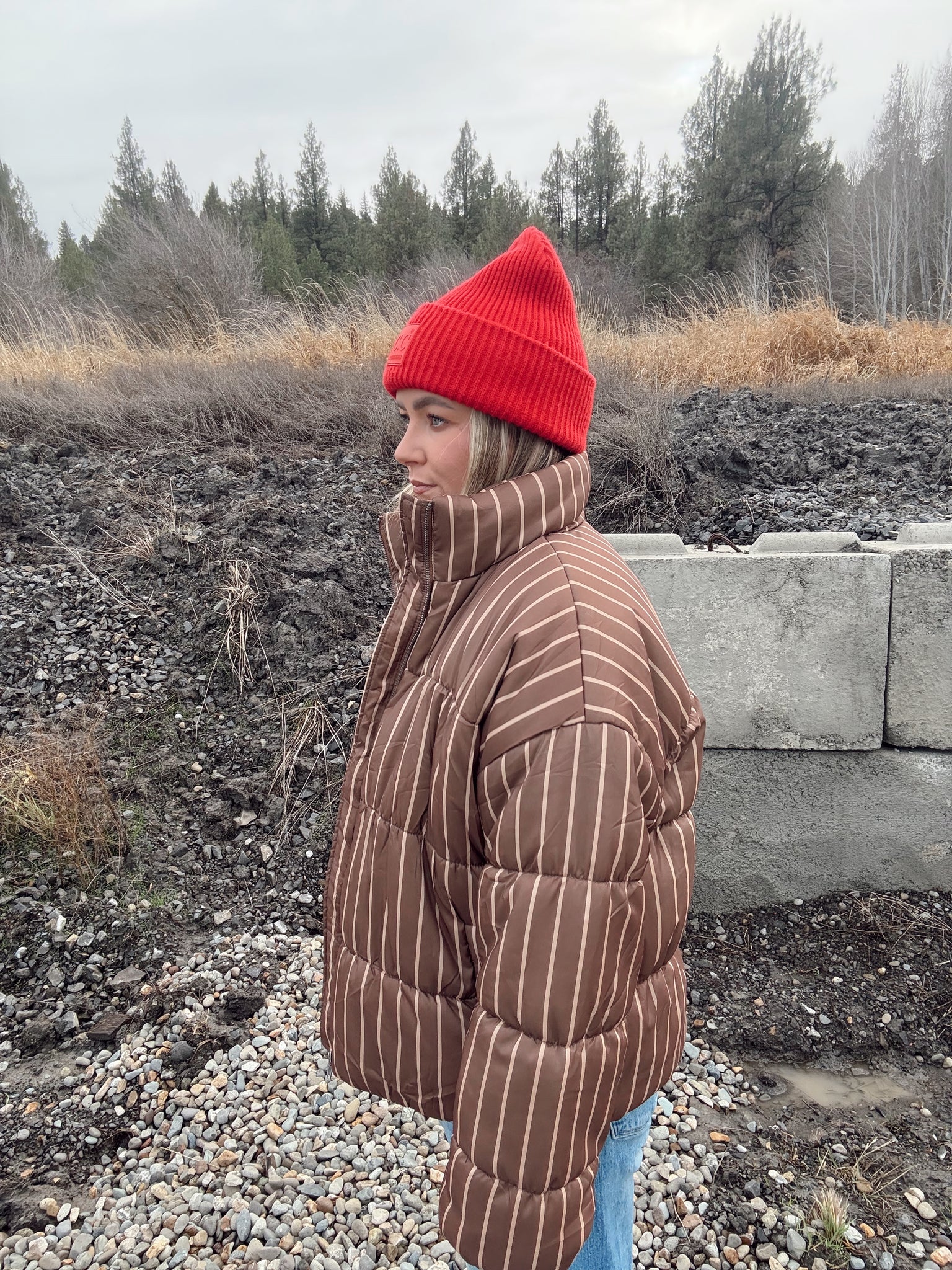 brown colored jacket with vertical beige stripes, high neck, front zipper, side pockets, padded & lined.