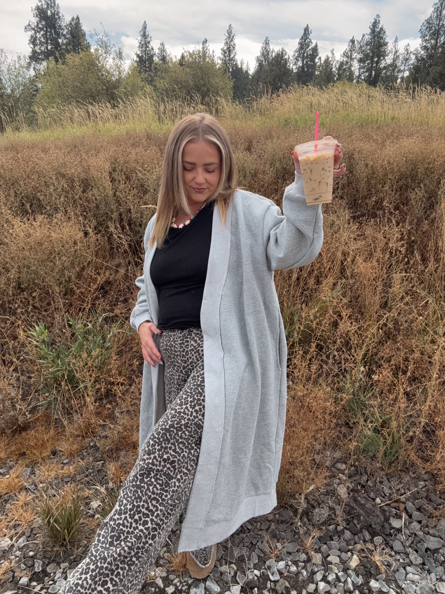 Long fleece cardigan in heather grey, thick, oversized, pockets on the sides, open front