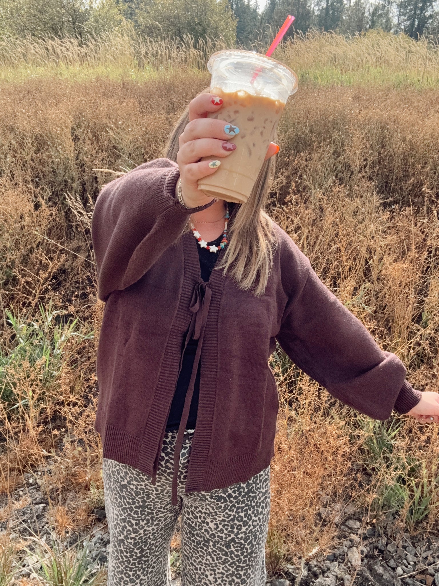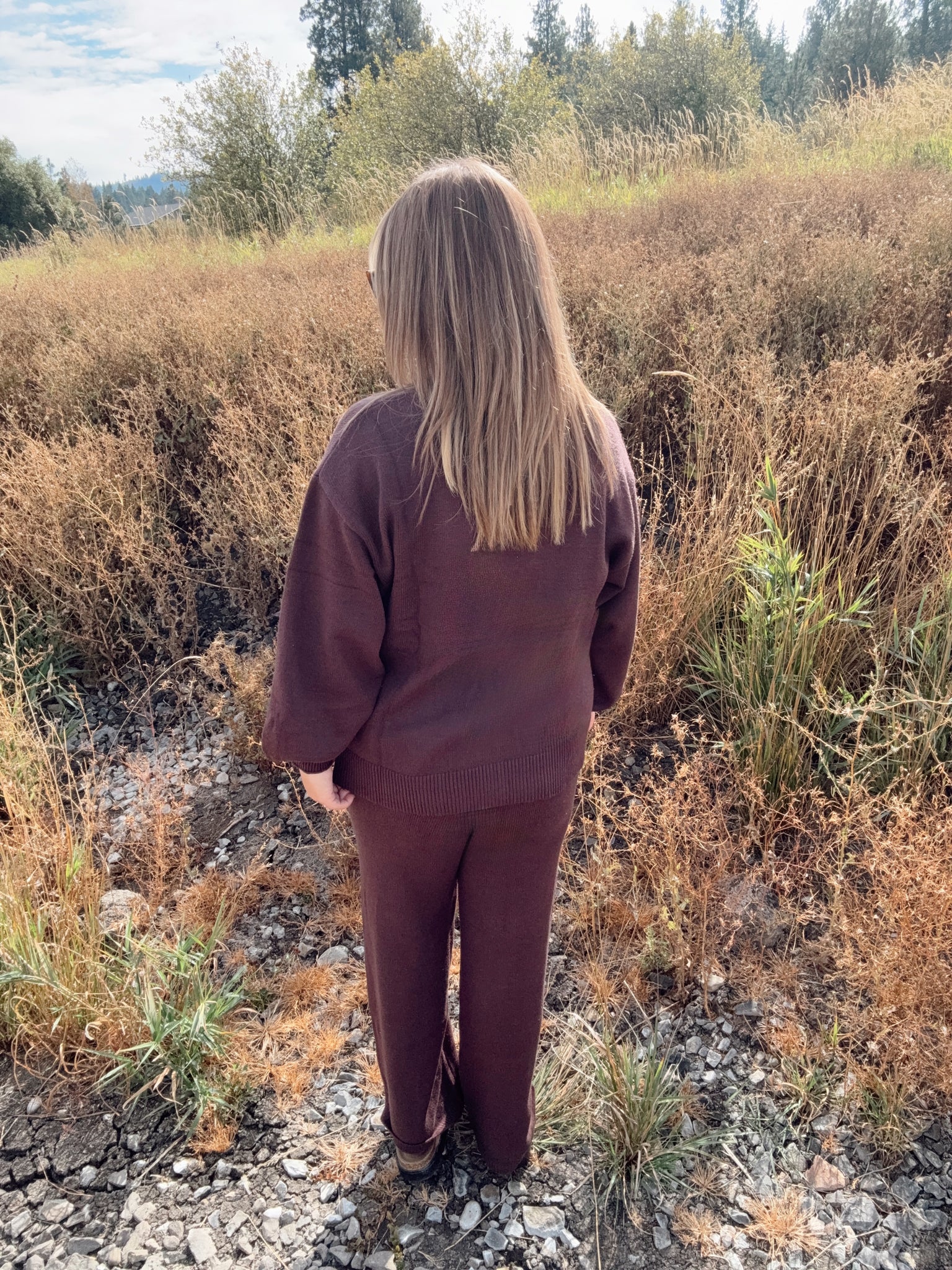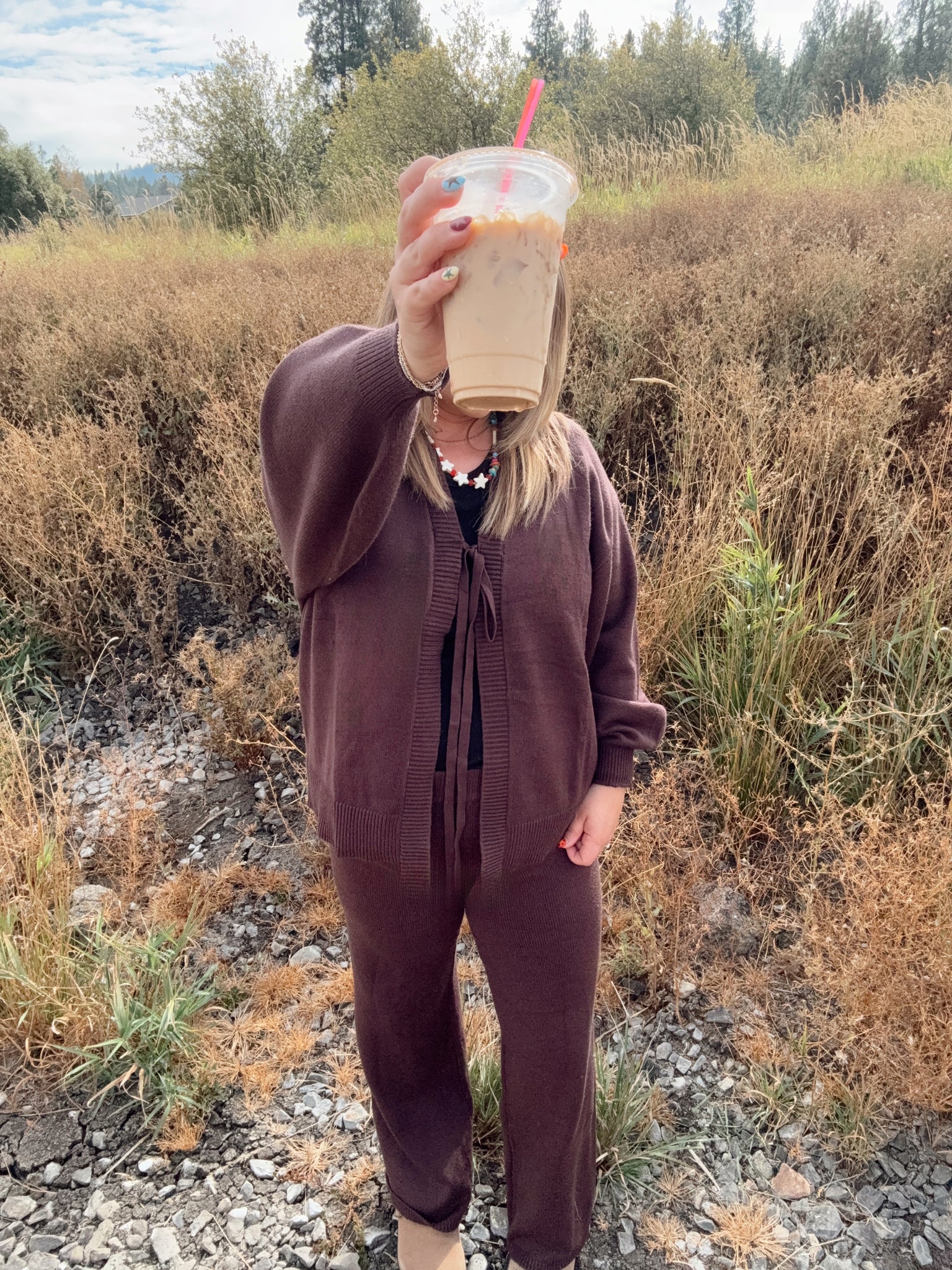 Relaxed cozy knit cardigan with center self tie ribbon closure & coordinating knit pants that feature a stretchy ribbed high waist waistband, ribbed hems & a slim-fit flared silhouette!